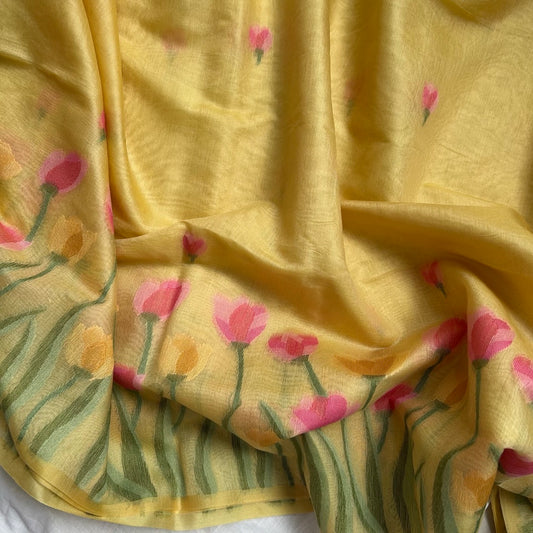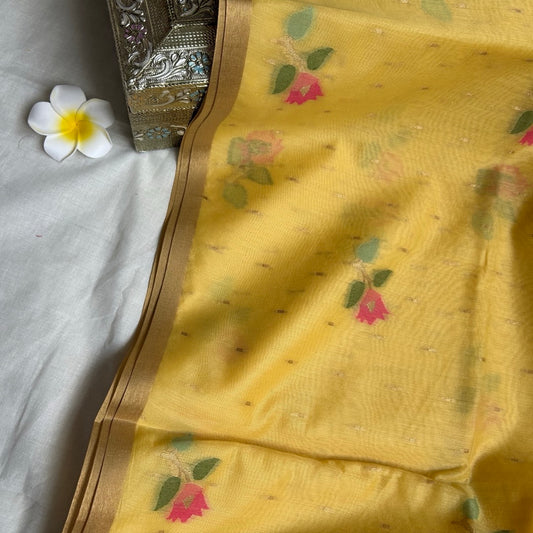 Mild Yellow Semi Linen Tulip Jamdhani Saree