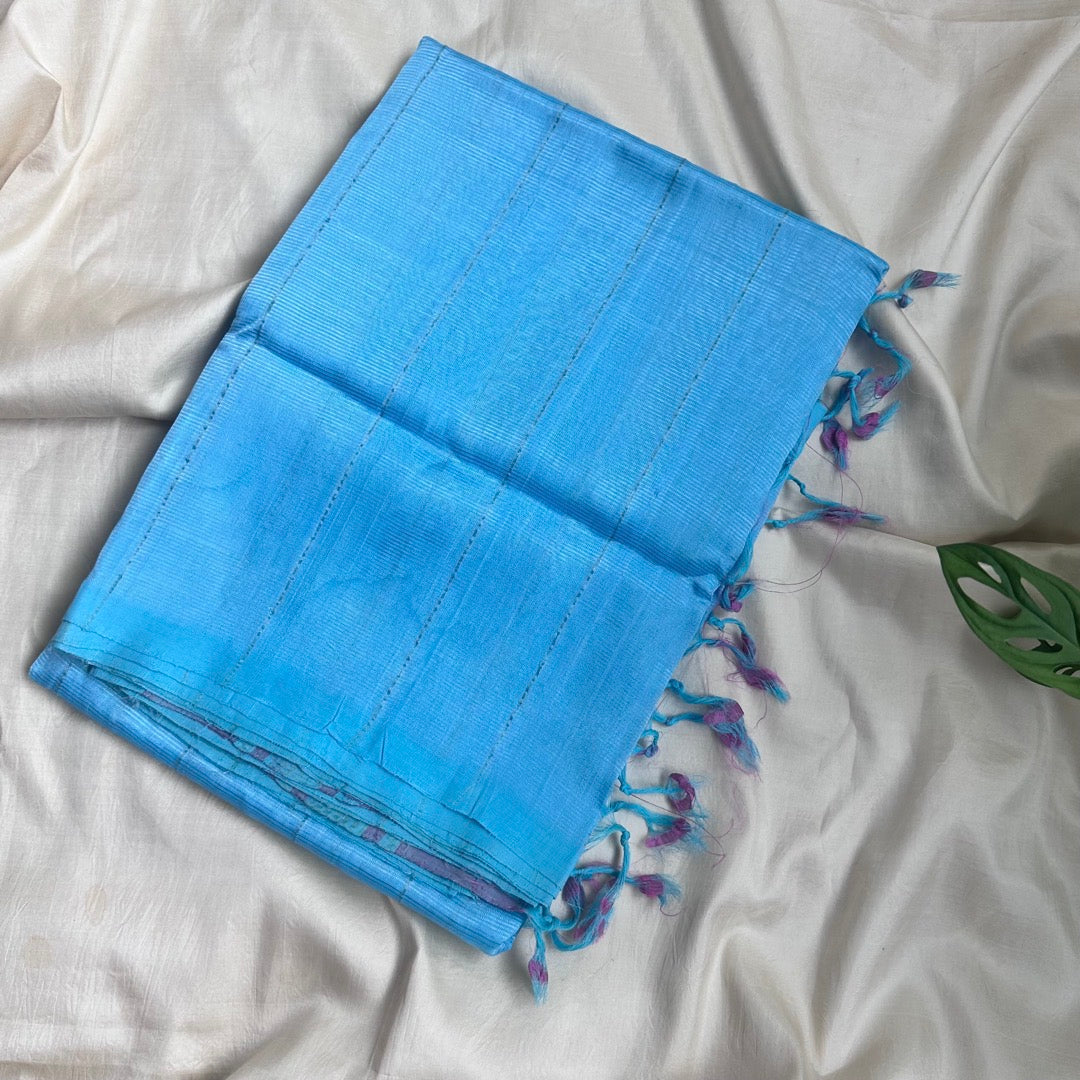 Saree Description :Mangalgiri Handloom Silk Cotton Light Blue saree, The body of the saree isLight Blue with thin zari lines running vertically all over the saree. The saree is light in weight and comfortable for all day wear and a perfect addition to your Festive style.