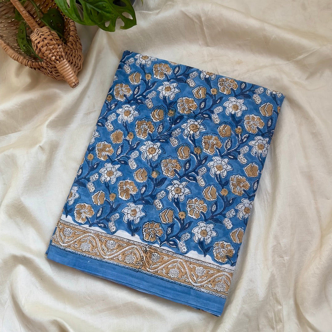 Saree Description : Mul mul Handprinted saree, The body of the saree is blue color with Handprinted floral pattern. The saree has a small border. The saree is super soft and perfect for Office/Casual wear.