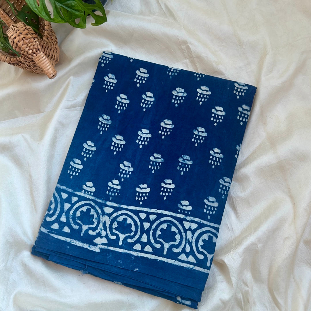 Saree Description : Mul mul Handprinted saree, The body of the saree is indigo color with Handprinted floral pattern. The saree has a small border. The saree is super soft and perfect for Office/Casual wear.