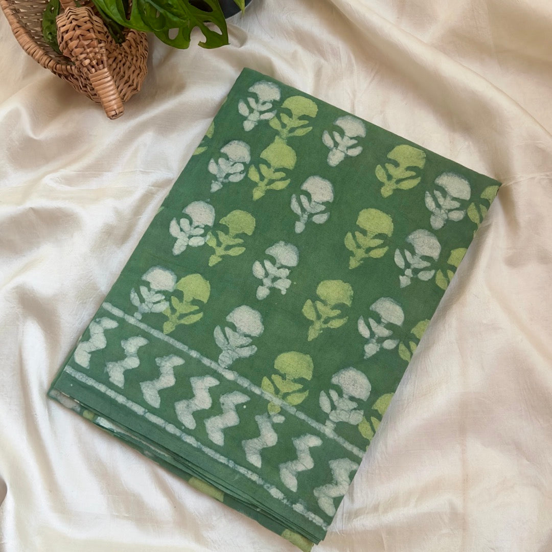 Saree Description : Mul mul Handprinted saree, The body of the saree is green color with Handprinted floral pattern. The saree has a small border. The saree is super soft and perfect for Office/Casual wear.