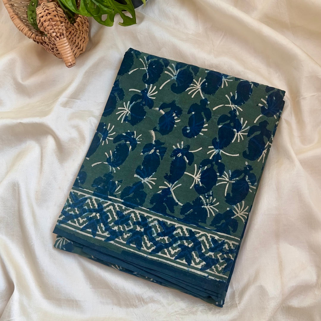 Saree Description : Mul mul Handprinted saree, The body of the saree is green color with Handprinted floral pattern. The saree has a small brown border. The saree is super soft and perfect for Office/Casual wear.