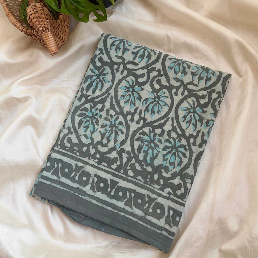 Saree Description : Mul mul Handprinted saree, The body of the saree is grey color with Handprinted floral pattern. The saree has a small brown border. The saree is super soft and perfect for Office/Casual wear.