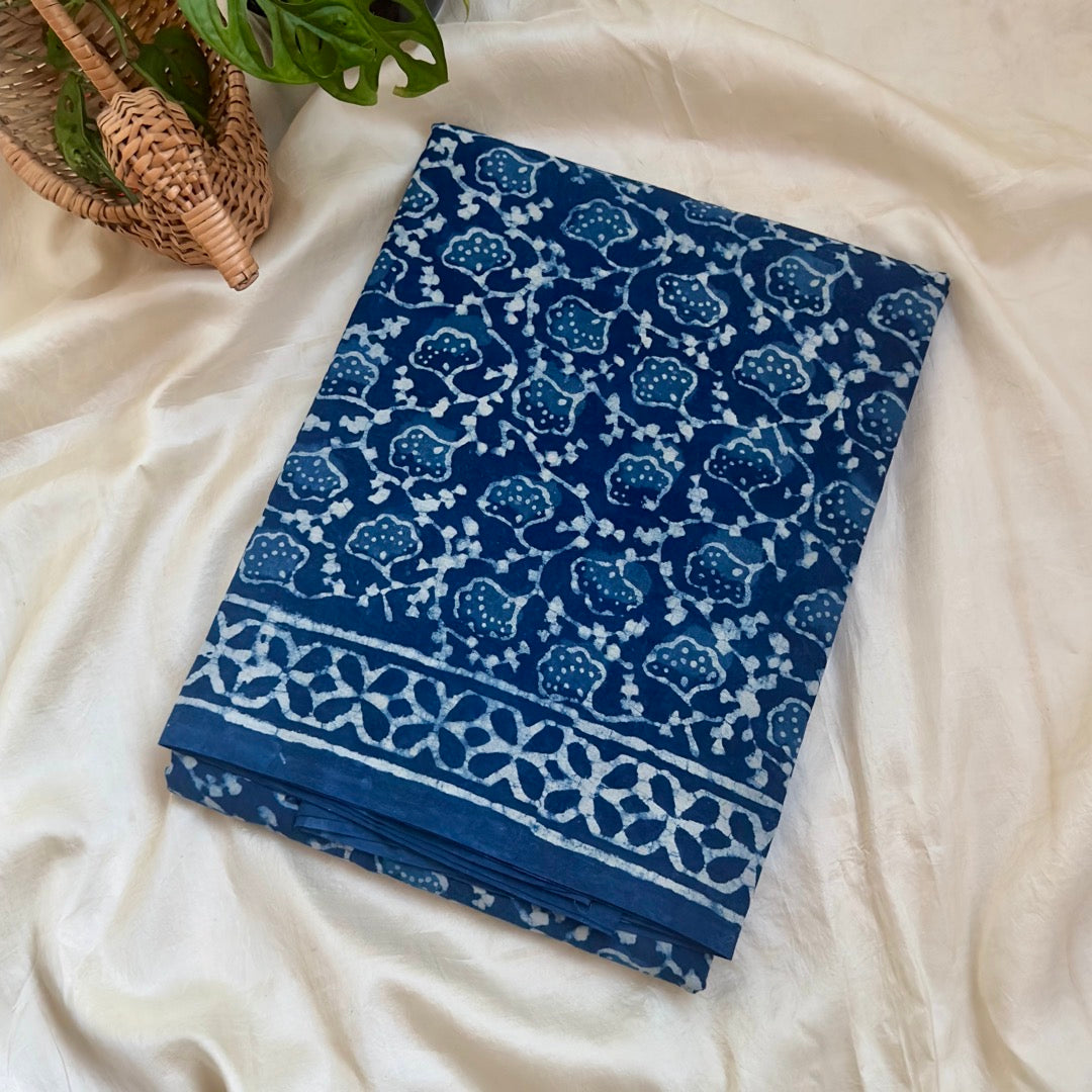 Saree Description : Mul mul Handprinted saree, The body of the saree is Indigo color with Handprinted floral pattern. The saree has a small border. The saree is super soft and perfect for Office/Casual wear.