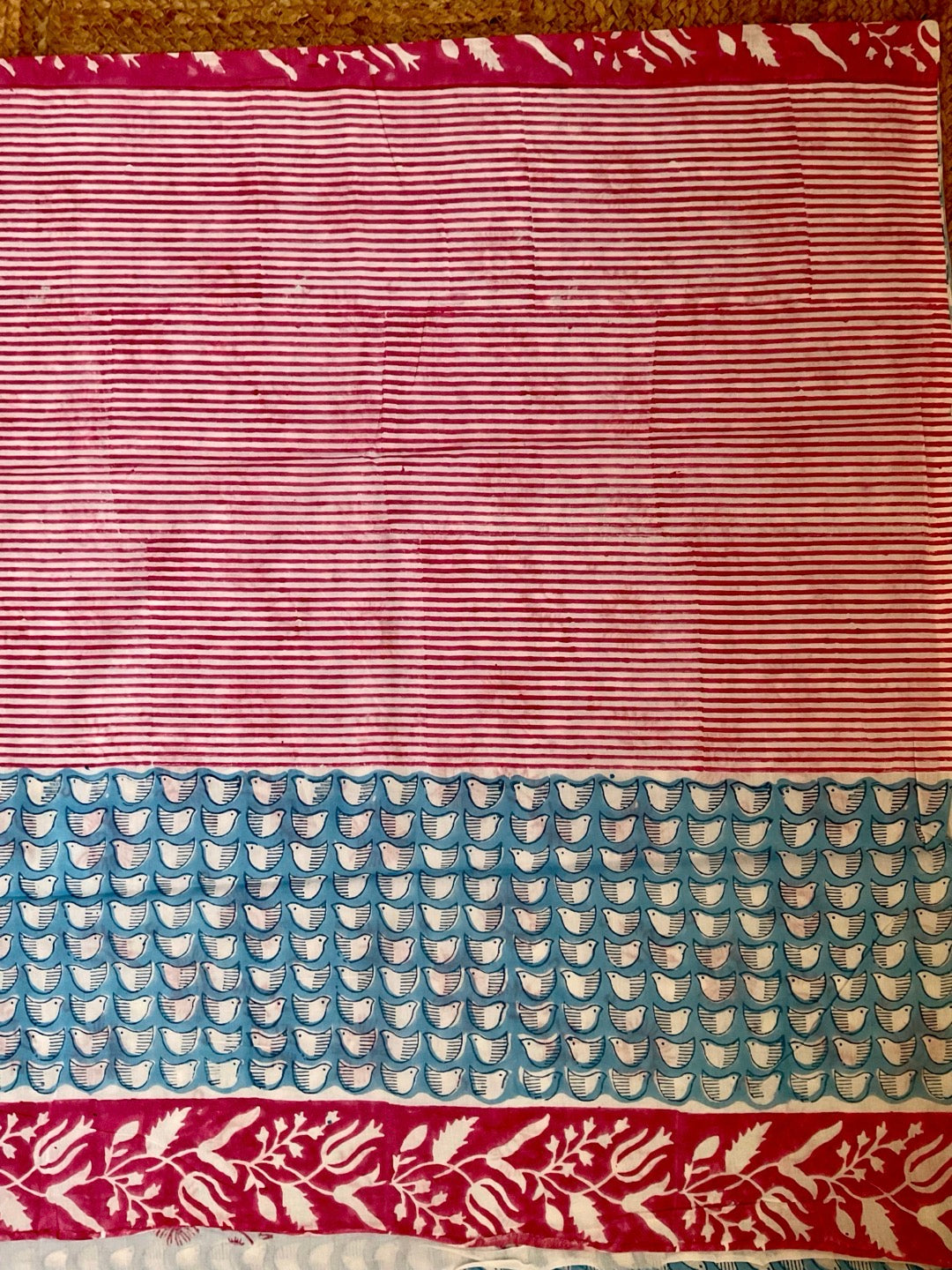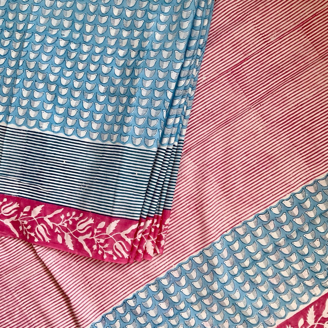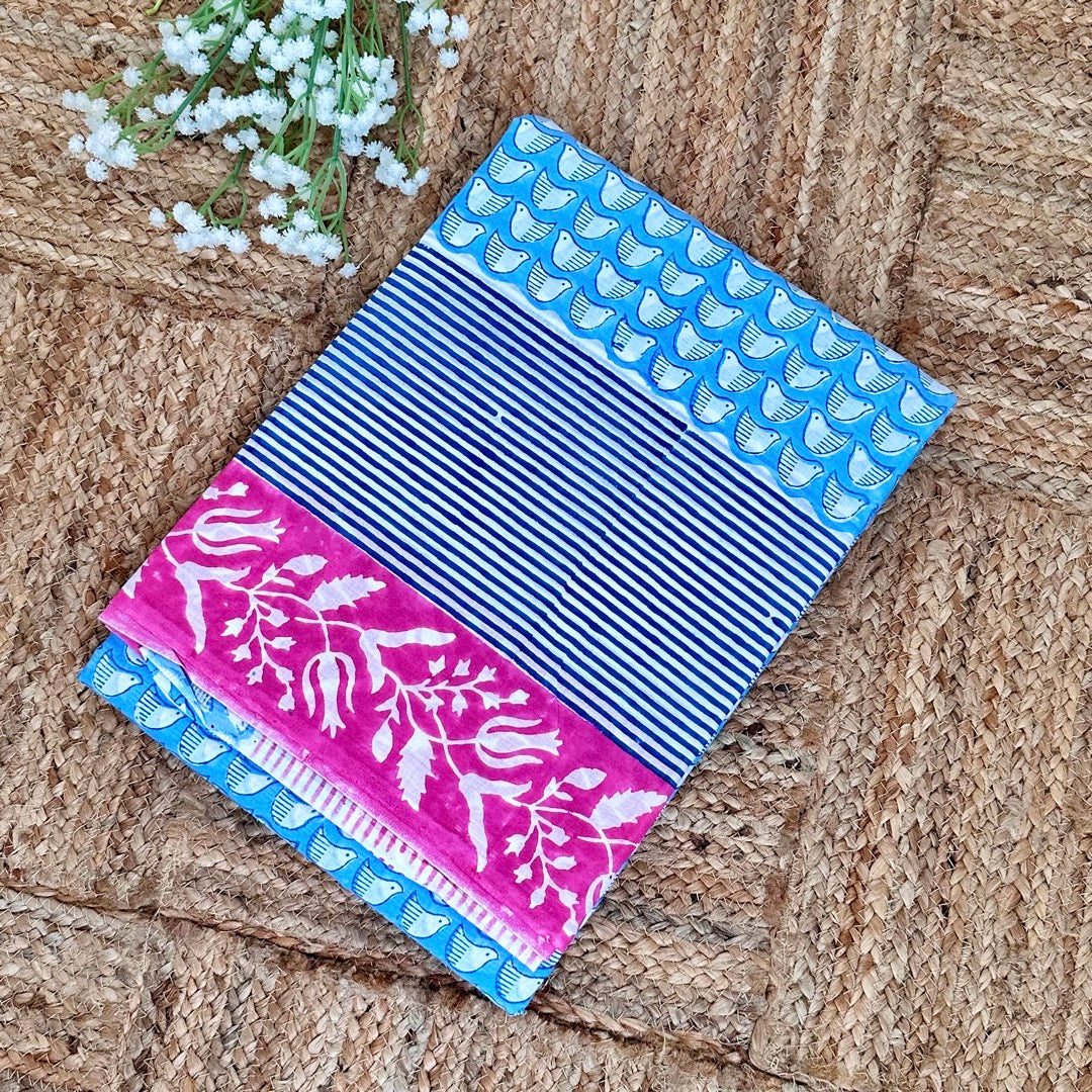 Saree Description : Mul mul Handprinted saree, The body of the saree is white colour with Handprinted blue stripes and designs across the saree. The border of the saree is pink printed. The saree is super soft and perfect for Office/Casual wear.