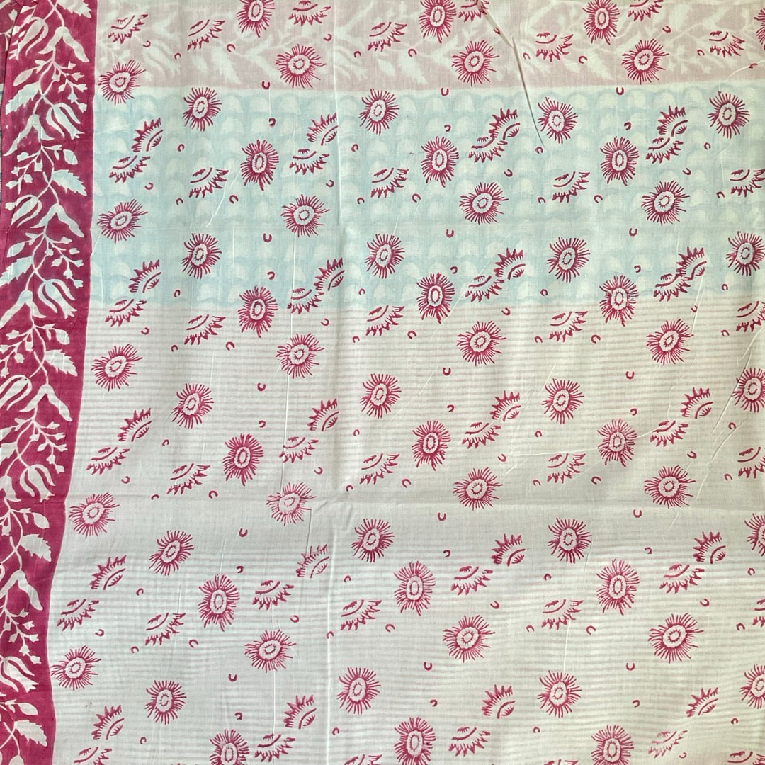 Blouse Piece : (Yes)Attached blouse is white colour with printed pink floral designs Handprinted, as show in the last image