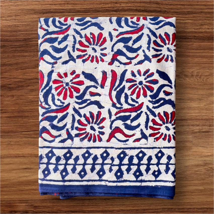 Saree Description : Mul mul Handprinted saree, The body of the saree is half white color with blue color floral pattern. The saree has a small black border. The saree is super soft and perfect for Office/Casual wear.