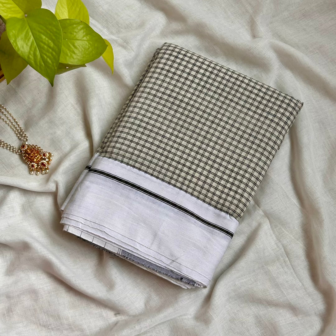 Saree Description :This Patteda Anchu Handloom Cotton Saree features a pristine white body adorned with fine black line checks all over, giving it a clean, classic, and timeless appeal. The saree is finished with a matching black border, creating a sleek and minimal look that never goes out of style.