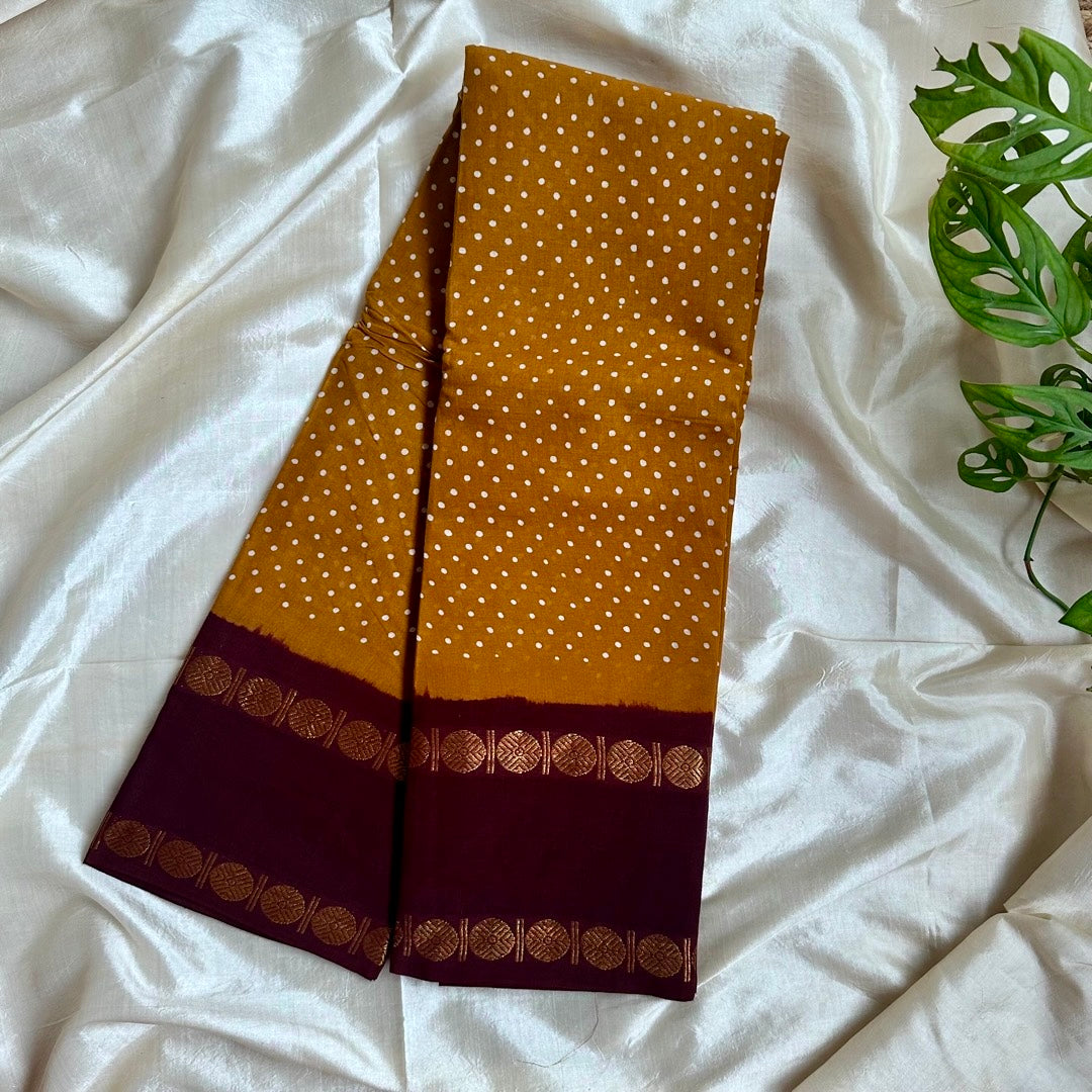 Saree Description : Sungudi Cotton saree, The body of the saree is Mustard in colour with Sungudi knot pattern all over the saree. The saree has thick Maroon borders at both the ends, with Rudraksham motifs. The saree is very light weight, soft and comfortable for all day wear for office.