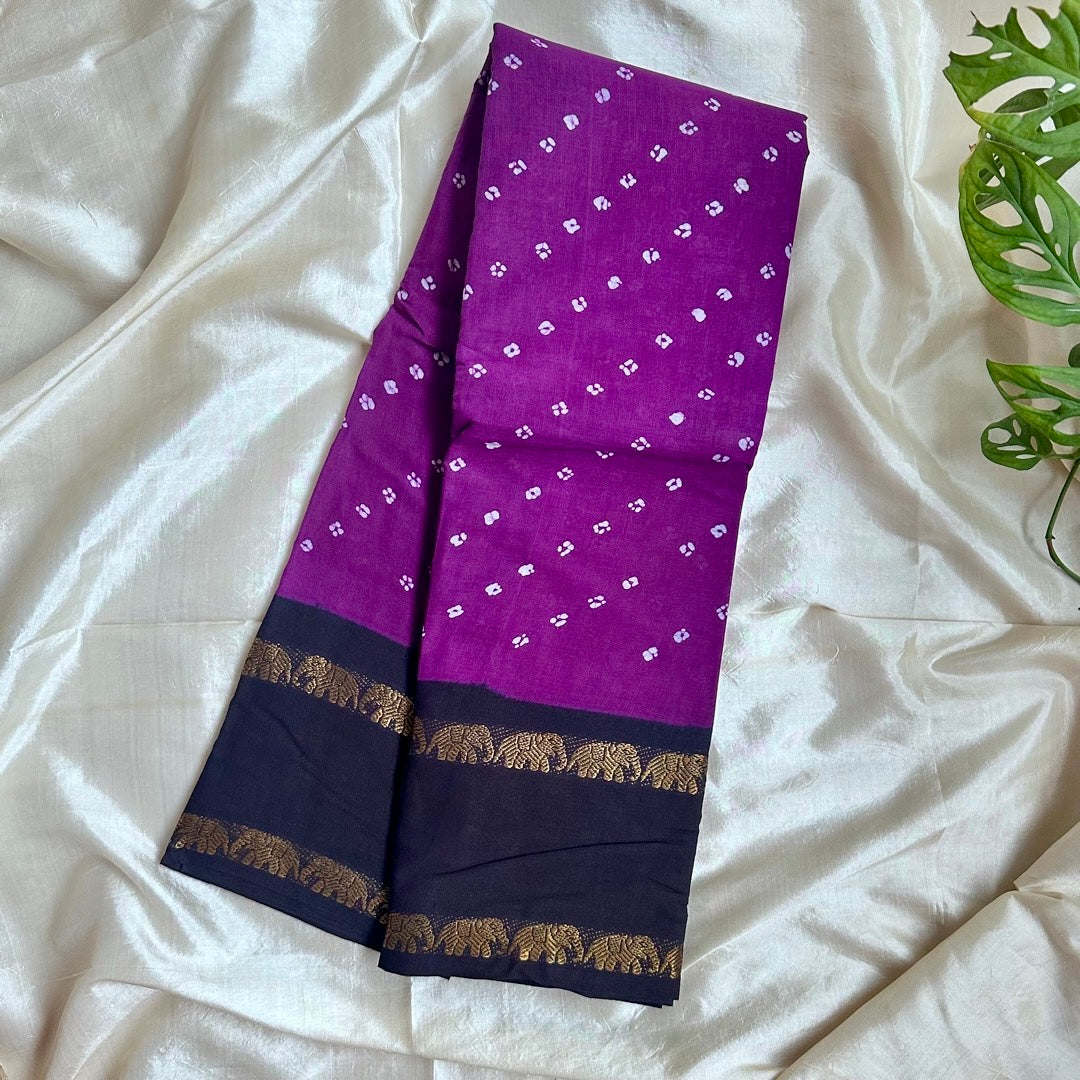 Saree Description : Sungudi Cotton saree, The body of the saree is Violet in colour with Sungudi knot pattern all over the saree. The saree has thick black borders at both the ends, with elephants motifs. The saree is very light weight, super soft and comfortable for all day wear for office.