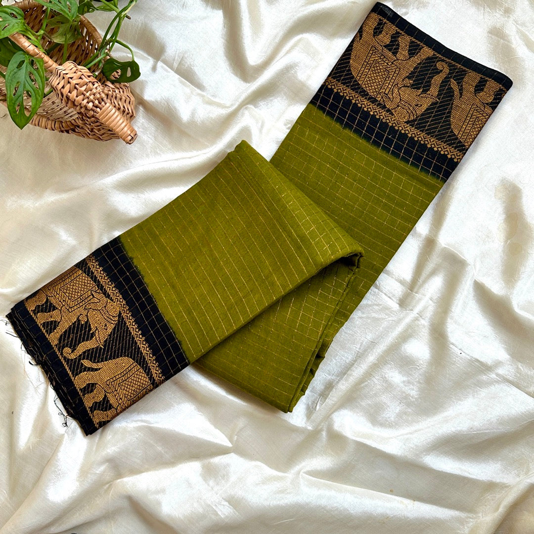 Saree Description : Sungudi cotton saree has a beautiful zari check design with contrast borders on both sides. The zari threads add a touch of elegance to the saree. It’s perfect for festive occasions with its vibrant and traditional look. The soft cotton fabric ensures comfort all day.